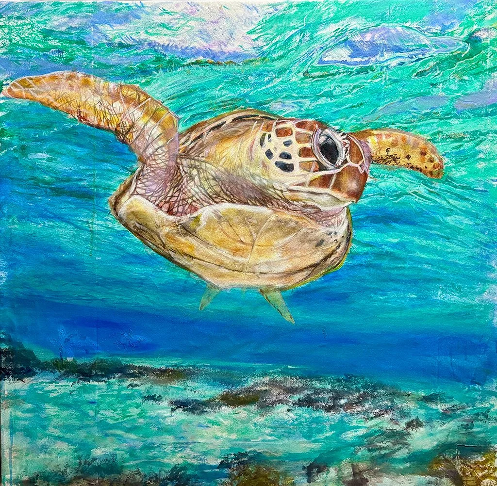 His painting “The Blues” is inspired by the crystal-clear Bahamian waters and the liberty and longevity embodied by turtles. The piece evokes peace and tranquility while honoring the warmth of Bahamian people, culture, and climate. Known for weaving shades of blue—his favorite color—into every creation, Culmer captures both realism and memory, inviting viewers to reflect on “the good ole days.”